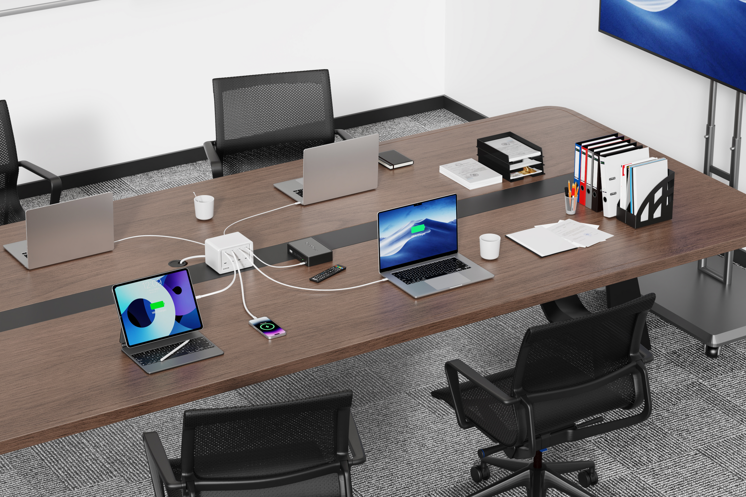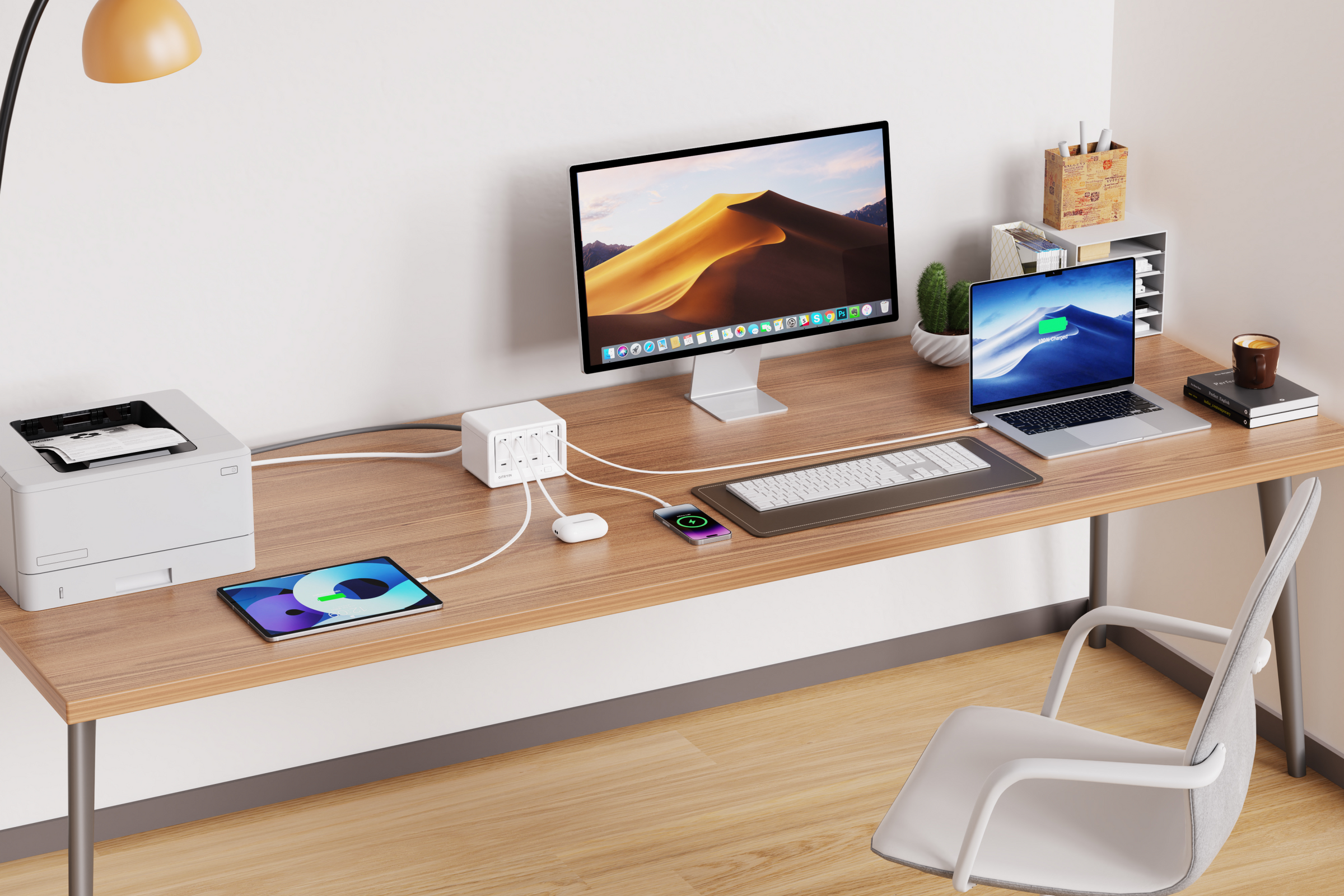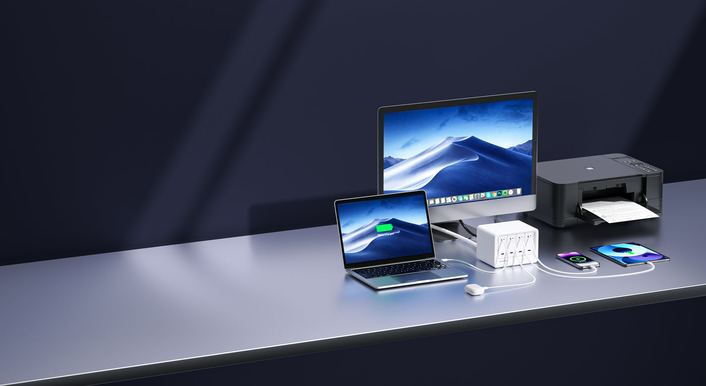 ACコンセント8口と巻き取り式40W USB-C充電ポート4口を搭載し、最大12台のデバイスに同時充電が可能。高出力を確保しつつ、デスクスペースを有効活用。 - 複数デバイスを安全に充電