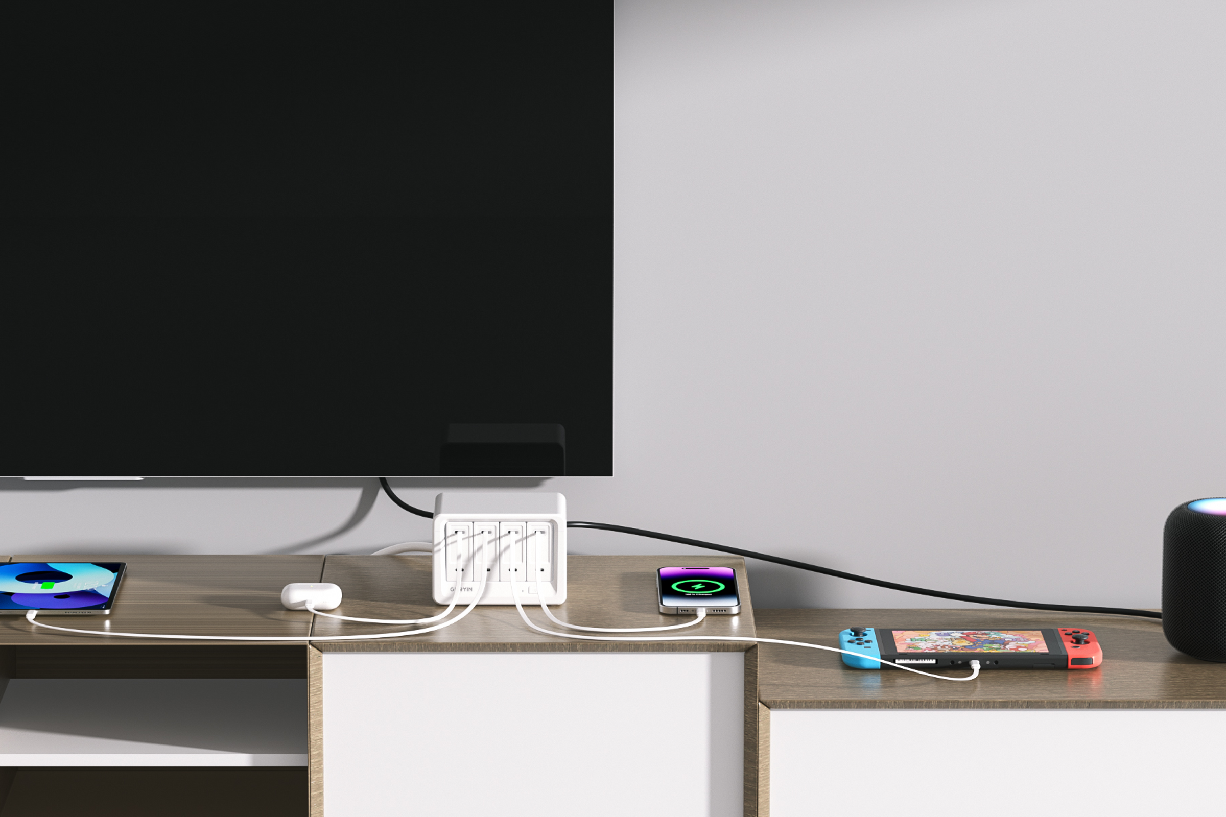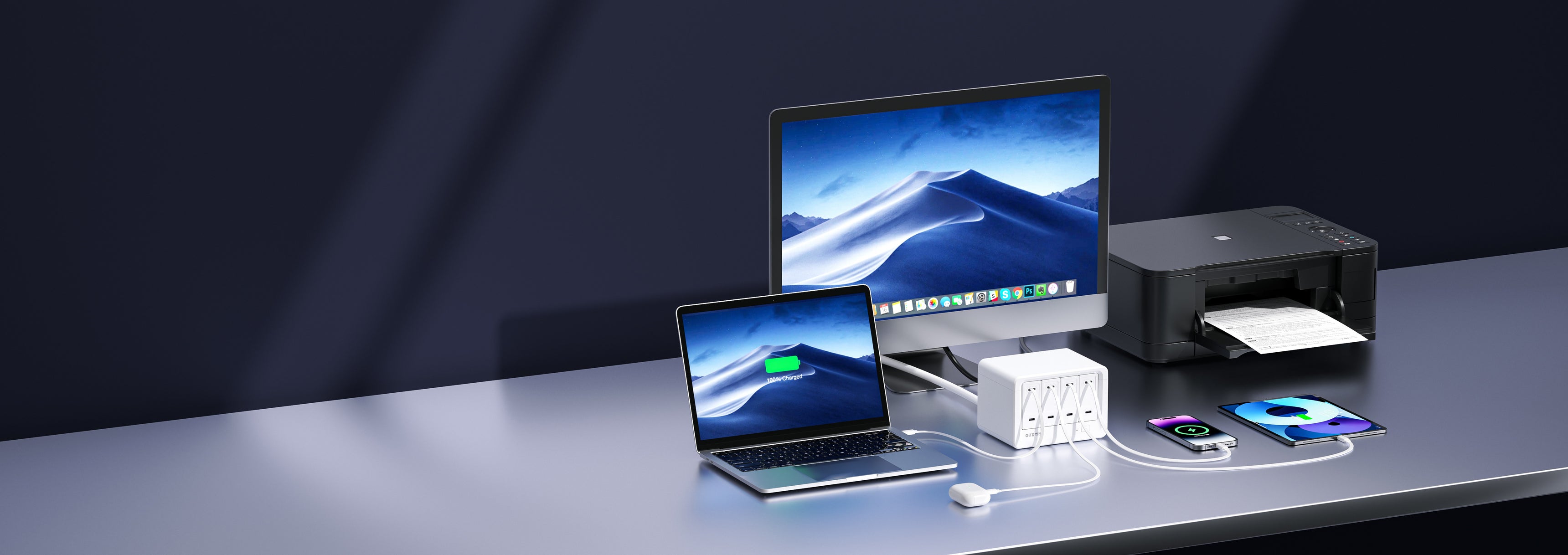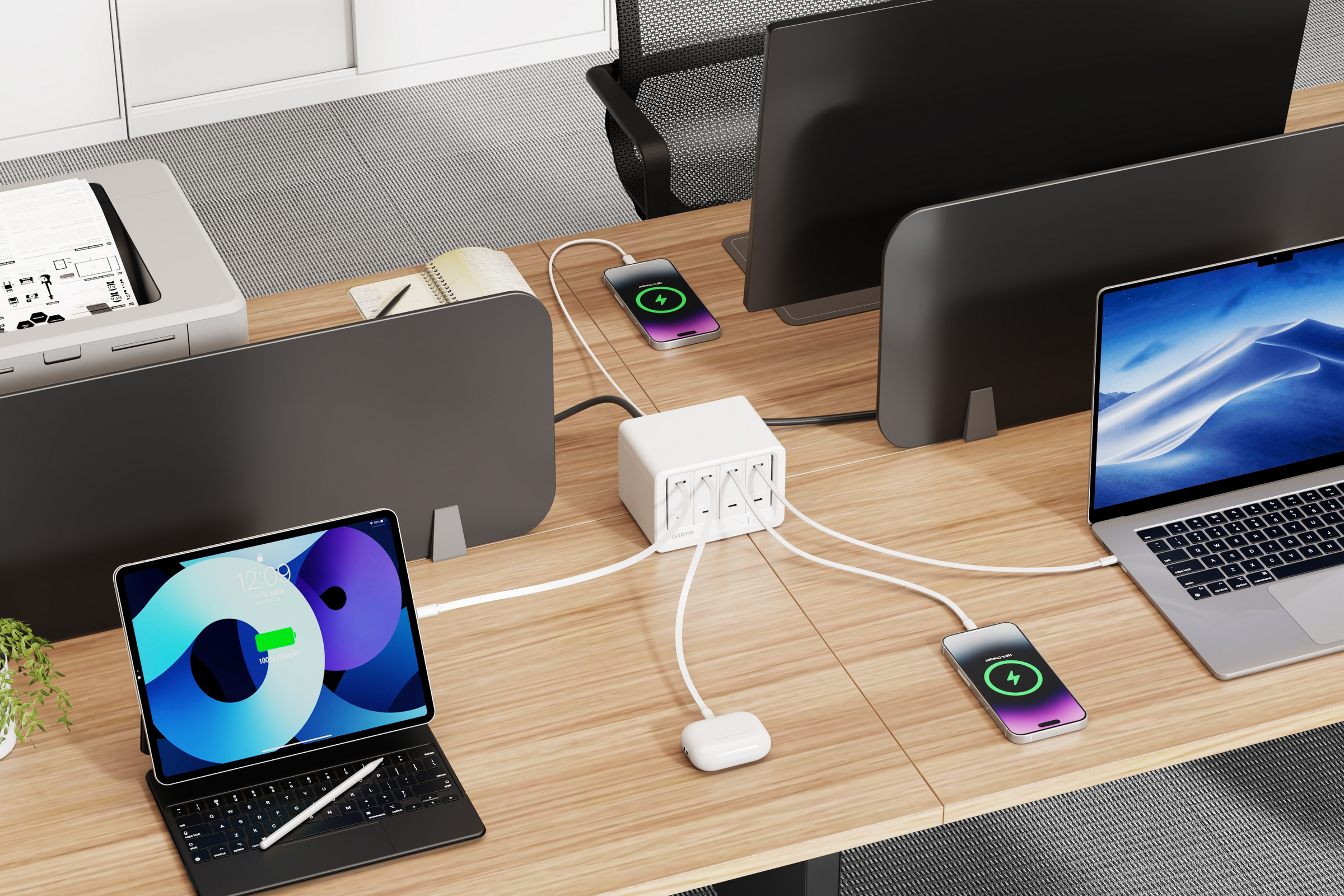 ACコンセント8口と巻き取り式40W USB-C充電ポート4口を搭載し、最大12台のデバイスに同時充電が可能。高出力を確保しつつ、デスクスペースを有効活用。 - 複数デバイスを安全に充電